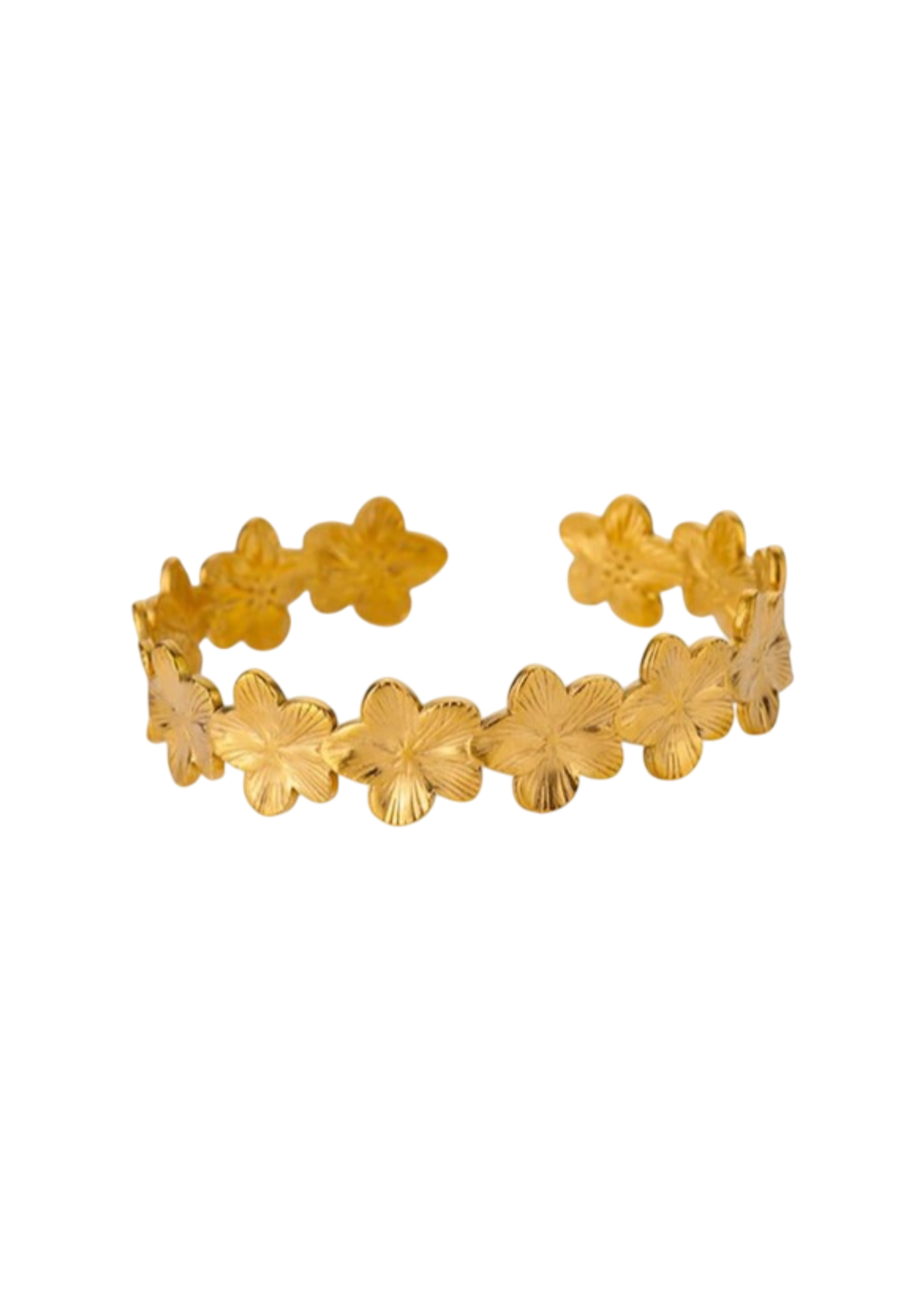 Der Floral Curve Armreif ist halboffen gestaltet und zeigt ein feines Blumendesign, das Leichtigkeit und Eleganz ausstrahlt. Zarte Details verleihen dem Schmuckstück eine feminine Note – ideal für den Alltag oder besondere Momente.