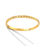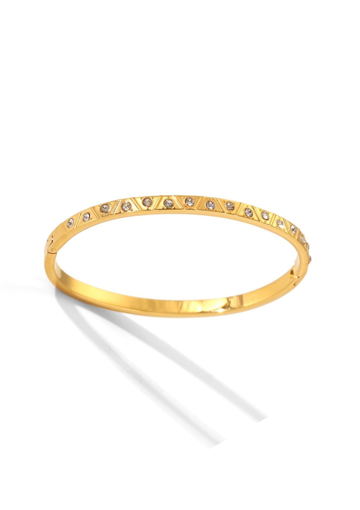 Der Gold Dots Armreif überzeugt mit seinem schlichten, aber raffinierten Design. Kleine, gleichmäßig gesetzte Glitzersteinchen sind in geometrische Muster eingefasst und verleihen dem Schmuckstück einen edlen, modernen Look – perfekt für Alltag und Anlass.