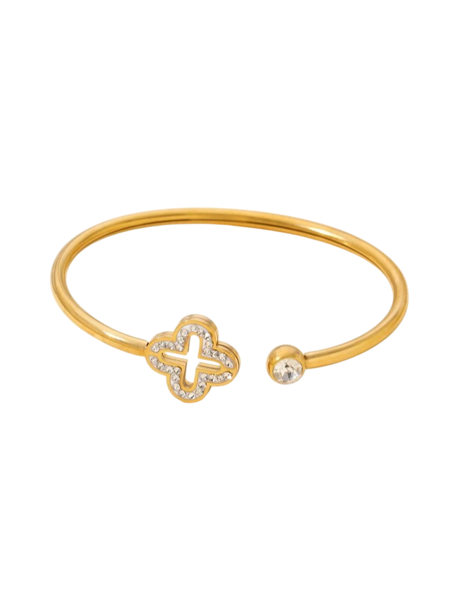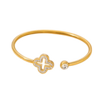 Der Lucky End Armreif vereint schlichtes Design mit symbolischer Bedeutung. Ein funkelndes Steinchen am einen Ende und ein zartes Kleeblatt vorn setzen dezente, stilvolle Akzente – ideal für jeden Tag und als kleiner Glücksbringer.