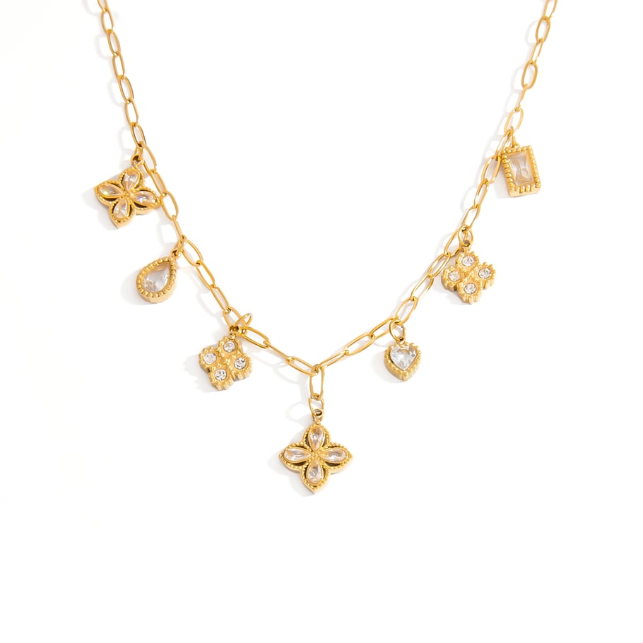 Die Liora Halskette verzaubert mit ihrem verspielten Charme und detailreichen Anhängern. Zarte Formen wie Blüten, Herzen und Tropfen schmiegen sich an eine feine Gliederkette in Goldoptik. Die funkelnden Akzente sorgen für ein elegantes Funkeln bei jedem Lichtstrahl.