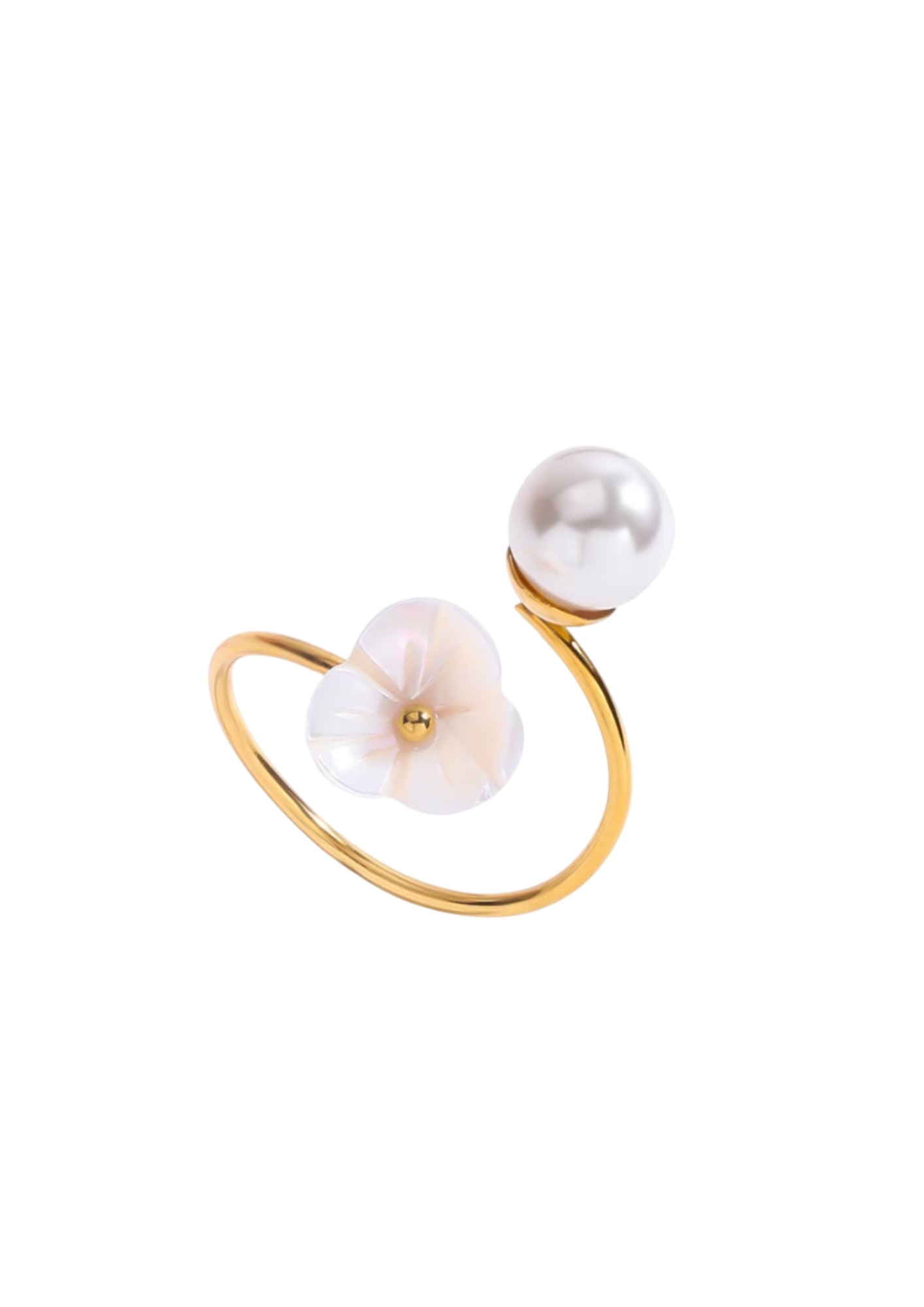 Der Pearl Bloom Ring kombiniert eine elegante weiße Perle mit einer zarten weißen Blume. Die offene, verstellbare Form sorgt für bequemen Sitz und flexible Passform. Das schlichte, feminine Design bringt eine natürliche Eleganz und wirkt zeitlos schön – ideal für jeden Anlass.