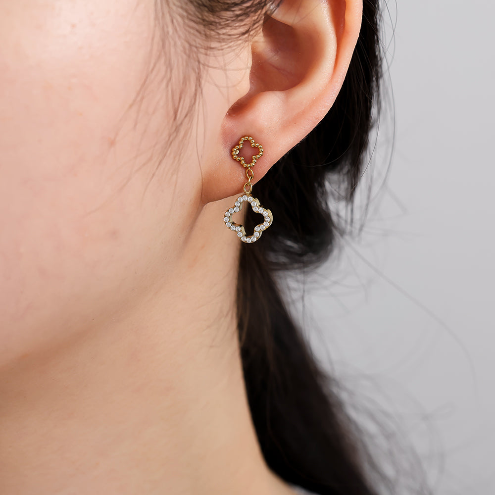 Die Lucky Duo Ohrringe vereinen ein filigranes Kleeblatt am oberen Ohr mit einem hängenden, glitzernden Kleeblatt für einen verspielten Look. Ihr elegantes Design bringt Glück und Lebensfreude zum Ausdruck und setzt jedem Outfit einen funkelnden, charmanten Akzent.